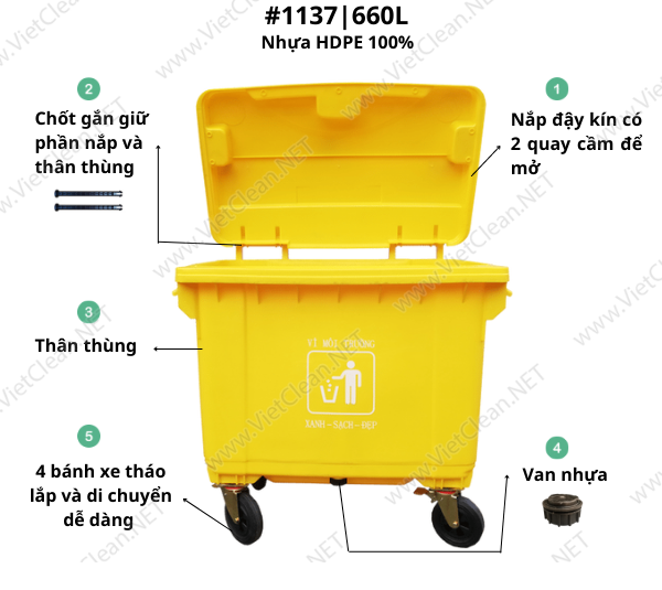 - Dung Tích Khổng Lồ (660L): Lý tưởng cho việc tập kết rác thải nguy hại với lưu lượng lớn hàng ngày tại bệnh viện quy mô.