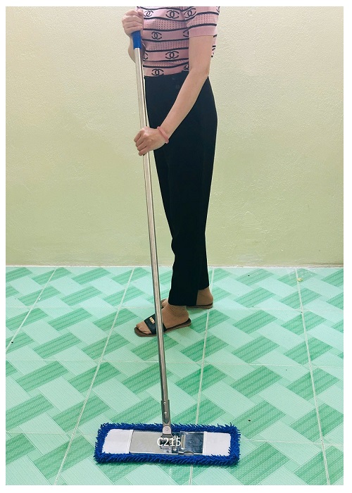 Cán cây: Cán cây bằng inox dạng thẳng dài 1.3m (130cm hoặc 1300mm), được nối với khung bàn lau chắc chắn, thiết kế đơn giản dễ thao tác. Phần trên cán có tay bọc bằng nhựa màu xanh dương chống trơn trượt, có lỗ móc treo lên sau khi sử dụng.
